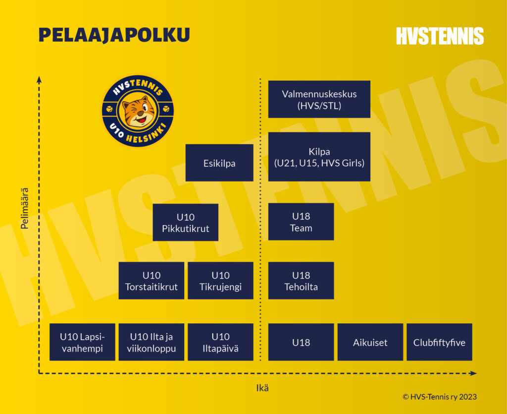 Toiminnan organisoinnin taustalla on ajatus vastata mahdollisimman hyvin pelaajien tavoitteisiin, kykyihin ja sitoutumisen asteeseen. Meillä kilpapelaajan pelaajan polku on jaettu kolmeen erilaiseen tavoitetasoon: Huippuryhmässä tavoitteena on junioreiden Grand Slam -kilpailut ja sitä kautta polku tennisammattilaisuuteen. Tämän ryhmän toiminnassa Tennisliiton ja HVS:n yhteistyössä operoimalla valmennuskeskuksella on suuri rooli. Kansallisilla kilpapoluilla yritämme tarjota mahdollisuudet kivuta aivan terävimpään kansalliseen kärkeen, menestykseen kansallisissa arvokilpailuissa, pelipaikkaan Tennisliigassa ja halutessaan hyvään 1.-divisioonan koulupaikkaan yliopistotenniksessä tai vaihtoehtoisesti selkeään A-luokan pelitasoon, mahdollisuuteen hakeutua USA:n yliopistotennikseen ja eväät elämänmittaiseen kilpatennisharrastukseen.