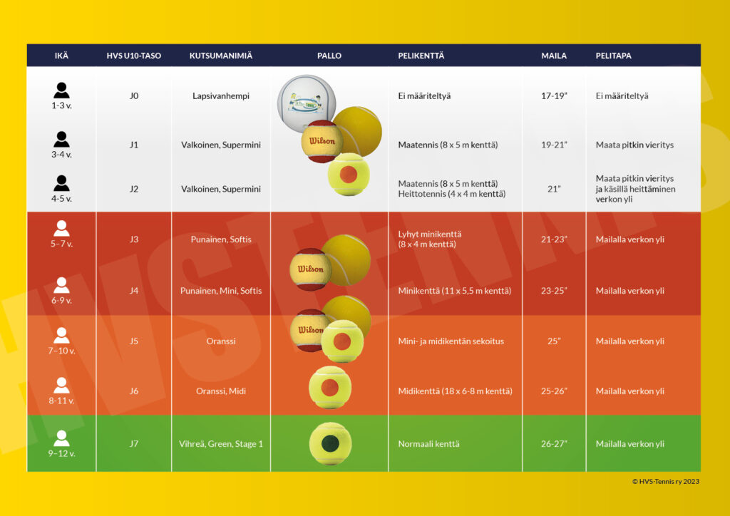 - to use of slower red, orange or green balls, smaller courts and smaller rackets following the guidelines set out by the ITF and supported by the Finnish Tennis Federation