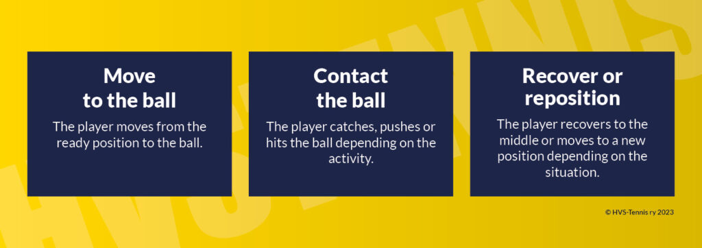 - Three phases in every stroke; movement to the ball (except the serve), hitting the ball, and recovery or repositioning after the shot. We ensure that these three phases are trained together as often as possible